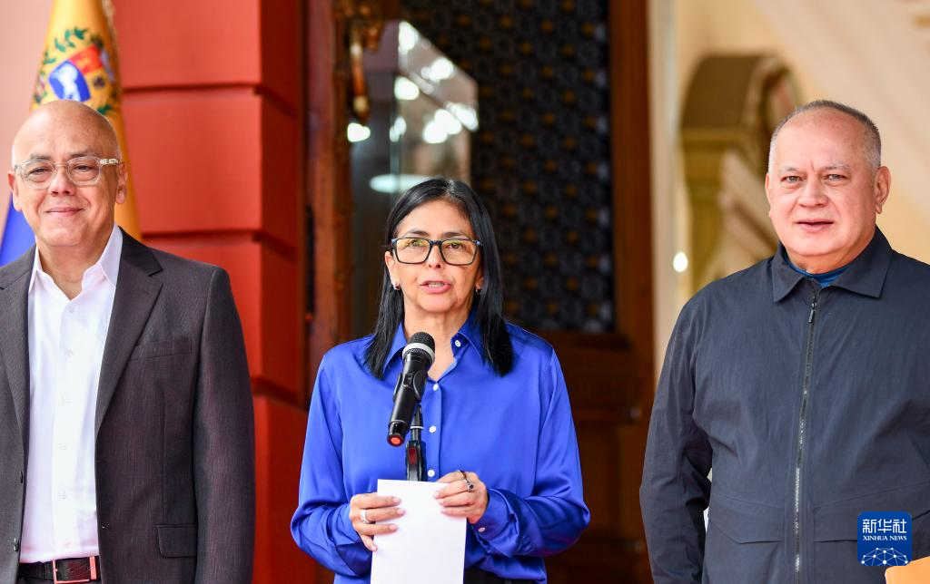 1月14日,在委内瑞拉首都加拉加斯的总统府观花宫,委内瑞拉代总统德尔西·罗德里格斯(中)、全国代表大会主席豪尔赫·罗德里格斯(左)和内政部长卡韦略共同参加新闻发布会。