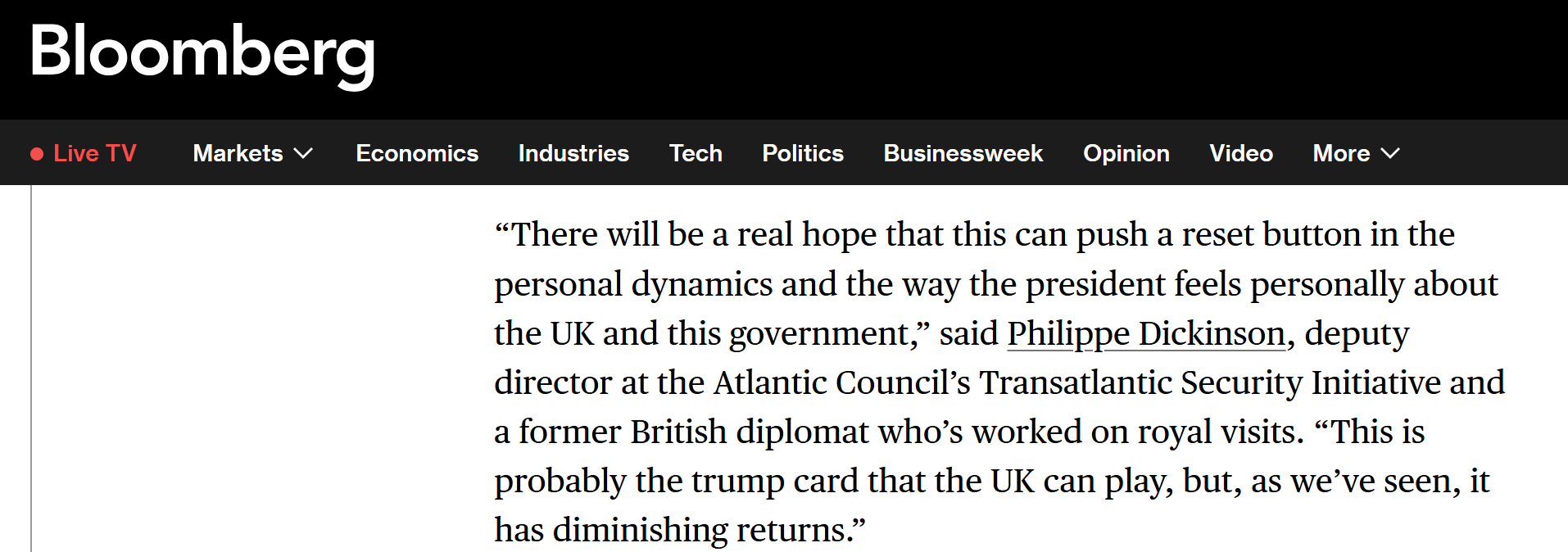 彭博社4月26日的报道援引大西洋理事会跨大西洋安全倡议副主任、英国前外交官菲利普·狄金森的话说,这或将有希望为英美关系按下重置键。他说,这是英国能打出的最后“王牌”,“但正如我们所见,其效力正在递减”。