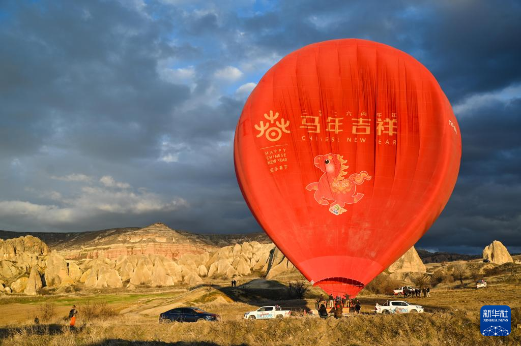 2月14日,在土耳其卡帕多基亚中国春节庆祝活动现场,中国马年主题的热气球正在充气。