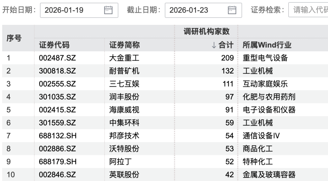 本周(1月19日-1月23日),机构调研上市公司热情不减。出海概念成为市场焦点,相关上市公司获调研频率较高,大金重工获超200家机构调研。