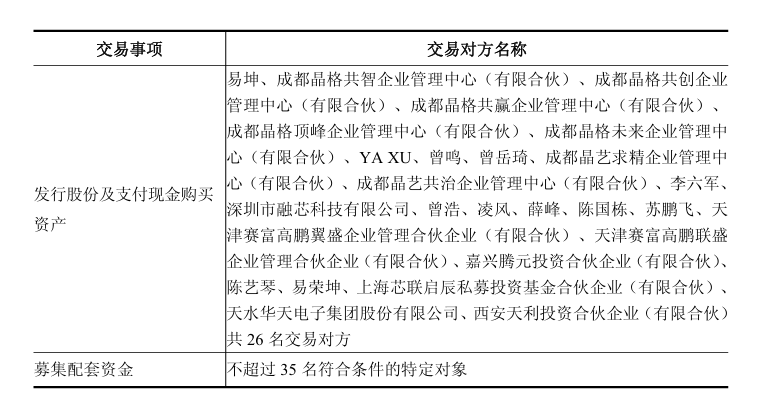 本次交易包括易坤、晶格共智、晶格共创、晶格共赢、晶格顶峰、晶格未来、YAXU、曾鸣、曾岳琦、晶艺求精、晶艺共治、李六军、融芯科技、曾浩、凌风、薛峰、陈国栋、苏鹏飞、高鹏翼盛、高鹏联盛、腾元投资、陈艺琴、易荣坤、芯联启辰、华天集团、天利投资,共26名交易对方。