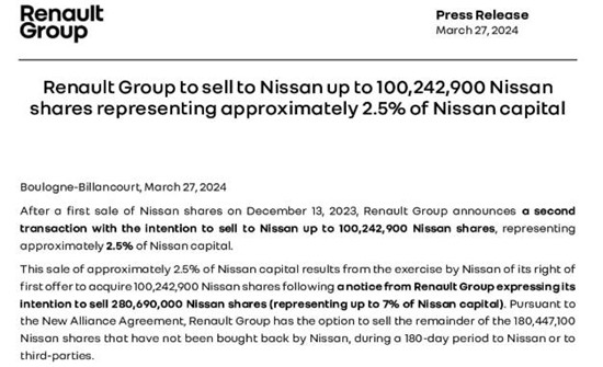 3月27日,雷诺集团宣布将向日产汽车出售最多100242900股日产汽车股份,约占日产总股本的2.5%。这是自2023年12月13日首次出售日产股份后,雷诺集团宣布进行的第二次交易。