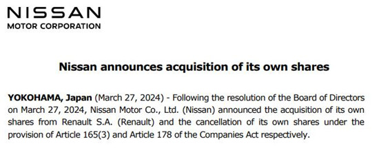 此次股份出售将作为日产汽车于2024年3月27日宣布的股票回购计划的一部分实施。日产还宣布,决定注销所有收购的股份,这将为日产的股东增益。