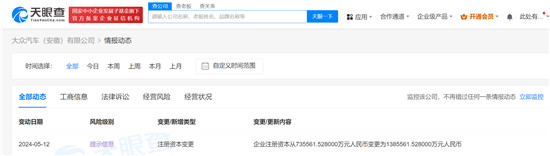 中国经济网北京5月14日讯(记者 张懿) 据天眼查App显示,5月12日,大众汽车(安徽)有限公司发生工商变更,注册资本由约73.56亿人民币增至约138.56亿人民币。股东信息显示,该公司由大众汽车(中国)投资有限公司、安徽江淮汽车集团股份有限公司共同持股,持股比例分别为75%和25%。