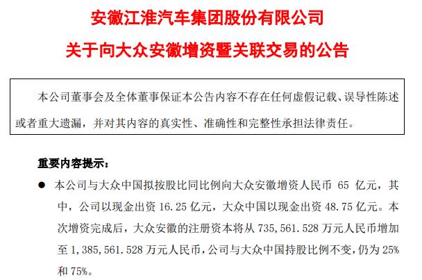 今年3月,江淮汽车发布公告称,大众安徽因经营发展需要,现拟增加 65 亿元的注册资本,拟由公司和大众中国同比例进行现金认购,其中公司拟认购大众安徽16.25亿元的注册资本,大众中国拟认购大众安徽48.75亿元注册资本。本次增资完成后,大众安徽的注册资本将从735561.528万元人民币增加至1385561.528万元人民币,股东持股比例不变。