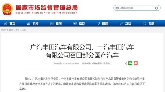 中国经济网北京9月30日讯(记者 郭跃)昨日,国家市场监督管理总局发布了5起乘用车召回公告,涉及丰田、比亚迪、领克、宝马、smart在内的5家品牌将共计召回车辆233612辆。其中,仅丰田品牌召回数量超过10万辆。