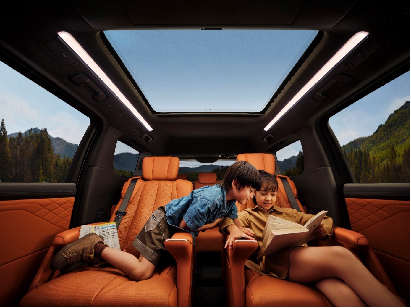 “五恒”座舱之上,至境世家还将健康守护延伸至视觉、触觉以及电磁辐射等多个维度,携手全球生态合作伙伴,共同定义座舱健康新规范。至境世家搭载南德TÜV护眼认证智慧顶灯,1.1米的贯穿式灯带集成阅读灯和氛围灯功能,支持分段照明,可三级调节色温与亮度,还可一键切换“客厅”、“书房”、“卧室”三种主题光效,精准匹配休憩、阅读或睡眠等不同场景。同时,至境世家首次搭载的三屏贯通式娱乐屏(含10.25吋仪表、16.3吋中控屏及16.3吋副驾屏),以及21英寸4K高清后舱智慧屏,均获得莱茵TÜV护眼认证。这些屏幕不仅画面显示细腻鲜亮,更能有效过滤有害光,显著缓解因长时间观看而产生的眩目与光刺激症状。
