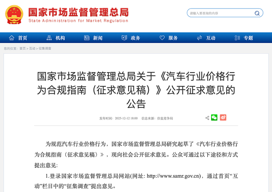 从7月16日国常会明确提出针对新能源汽车“加强成本调查和价格监测”,到相关部门约谈多家车企代表,再到年底前,12月12日,中国国家市场监督管理总局发布《汽车行业价格行为合规指南(征求意见稿)》,明确指出,汽车销售必须明码标价,不得以虚假的“限时降价”“清仓价”等名义进行宣传,反映出国家层面对“价格战”监管的精准出手。