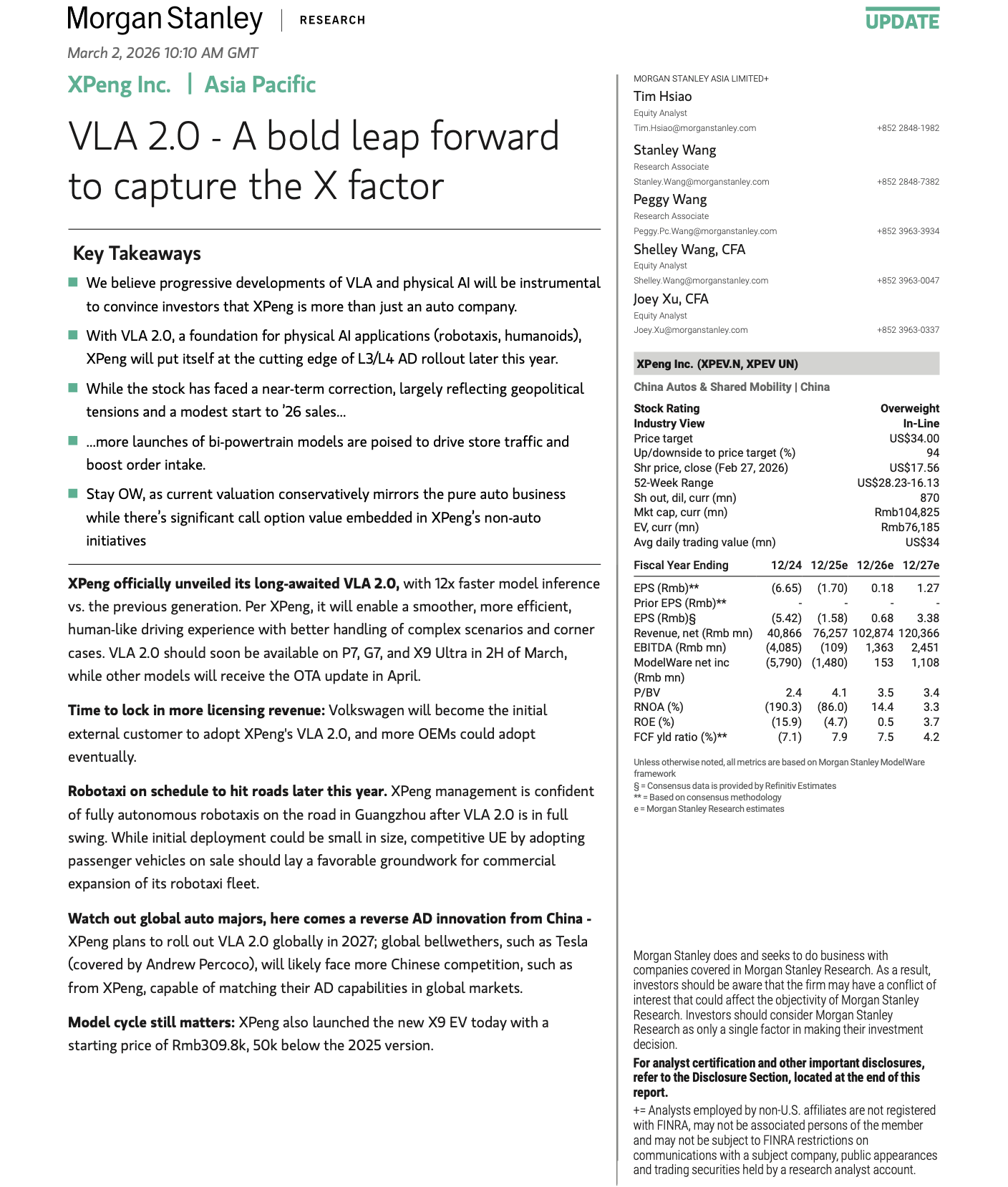 国际投行摩根士丹利近日发布题为《VLA 2.0——一次大胆跃迁》的最新研究报告指出,中国车企小鹏汽车在自动驾驶领域的技术进展,正使其具备与特斯拉在全球市场正面竞争的能力。报告认为,在自动驾驶进入新阶段的背景下,全球智能汽车产业格局或迎来新的变量。