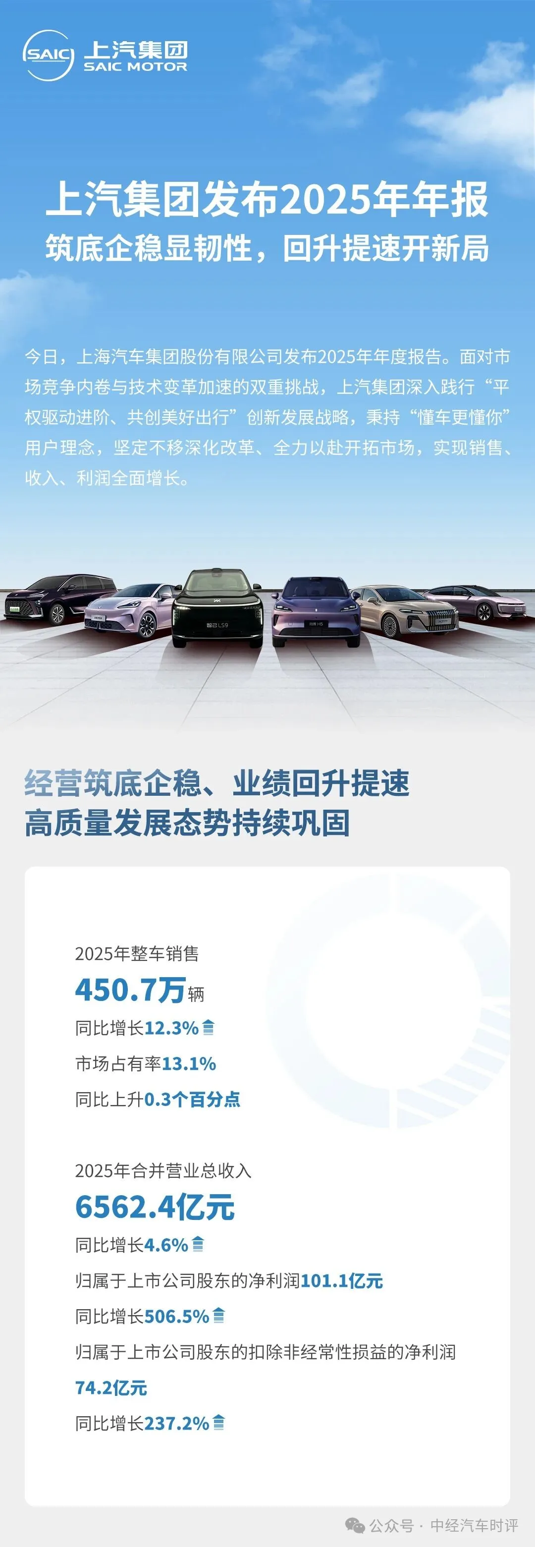 一份亮眼的成绩单印证了这一举措的成功,2025年,上汽集团销售实现两位数增长、归属于上市公司股东的扣除非经常性损益的净利润更是大增237.2%。