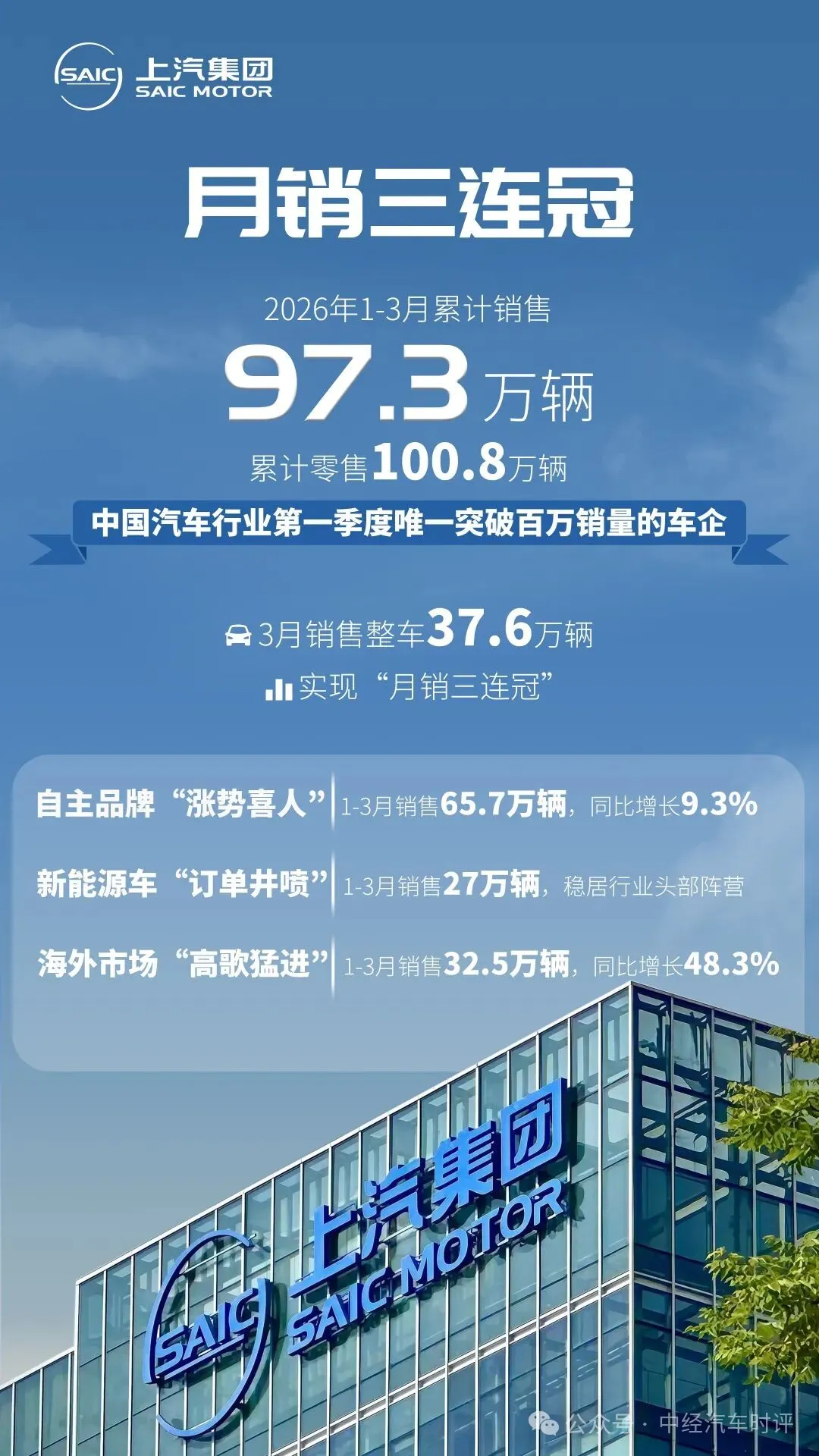 一季度,上汽集团实现月销三连冠,1-3月累计批售97.3万辆,零售更是突破百万辆大关,成为第一季度国内唯一突破百万销量的车企。
