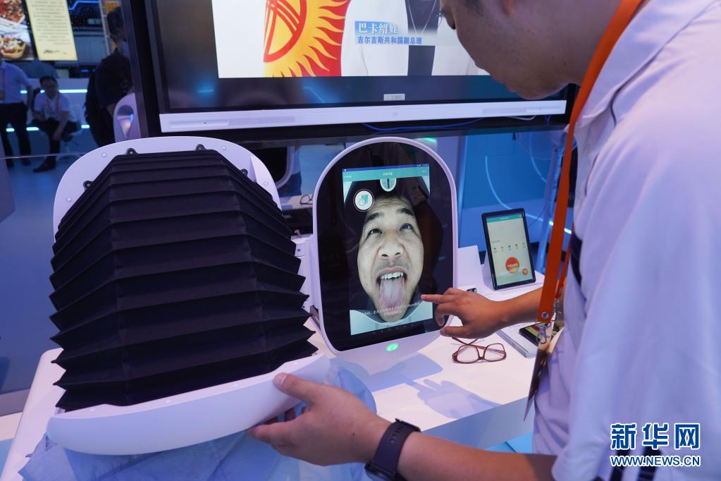 7月29日,论坛展馆里展示的“智能四诊仪”在给观众查看舌苔。