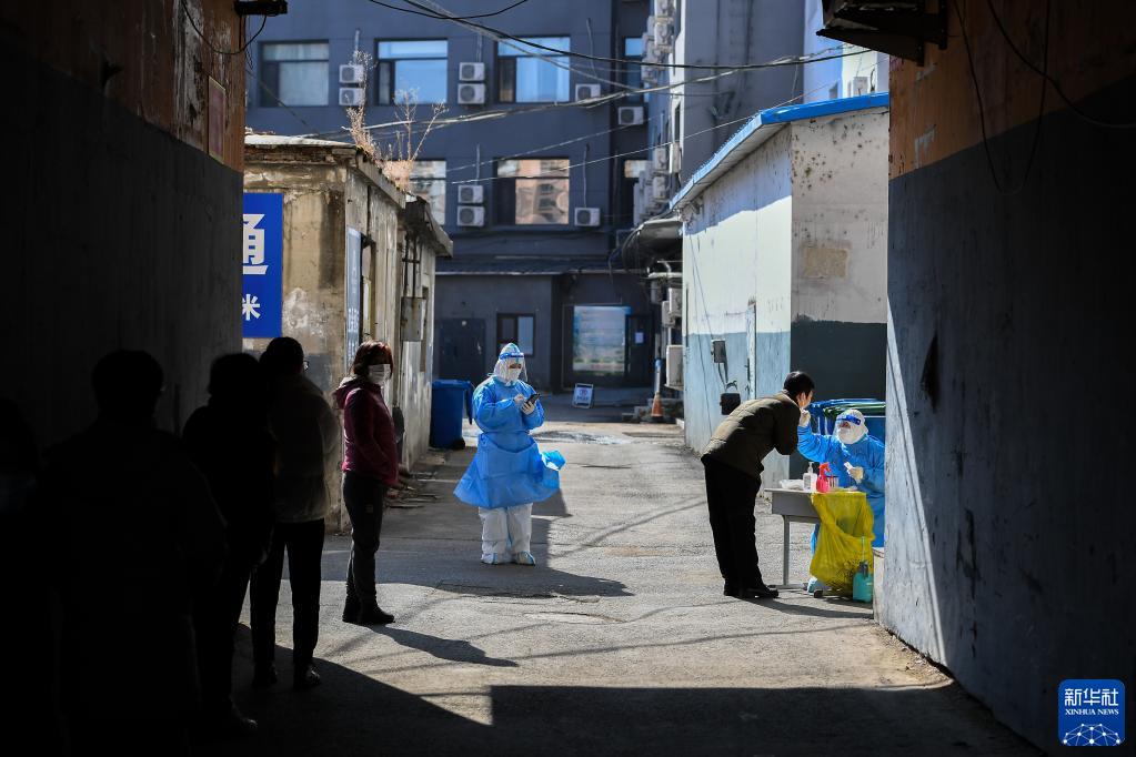 3月26日,在吉林市船营区大东街道一核酸检测采样点,工作人员为居民进行核酸检测采样。