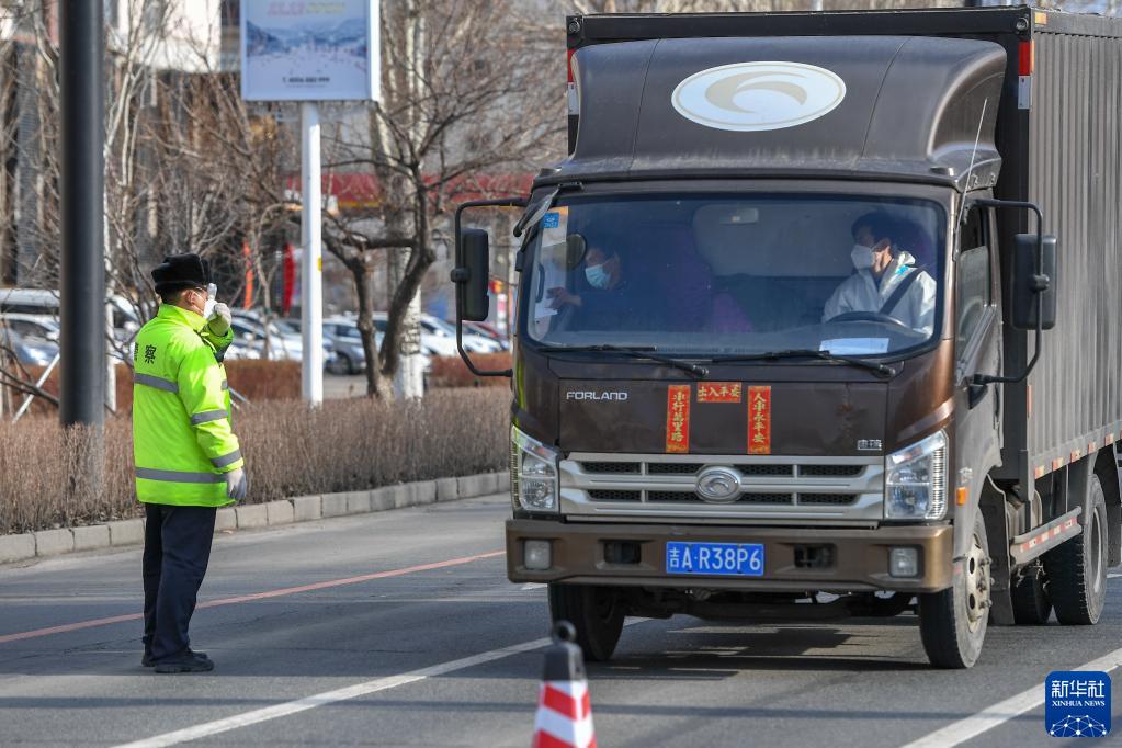 3月26日,在吉林市解放东路,交警检查过往车辆通行证。