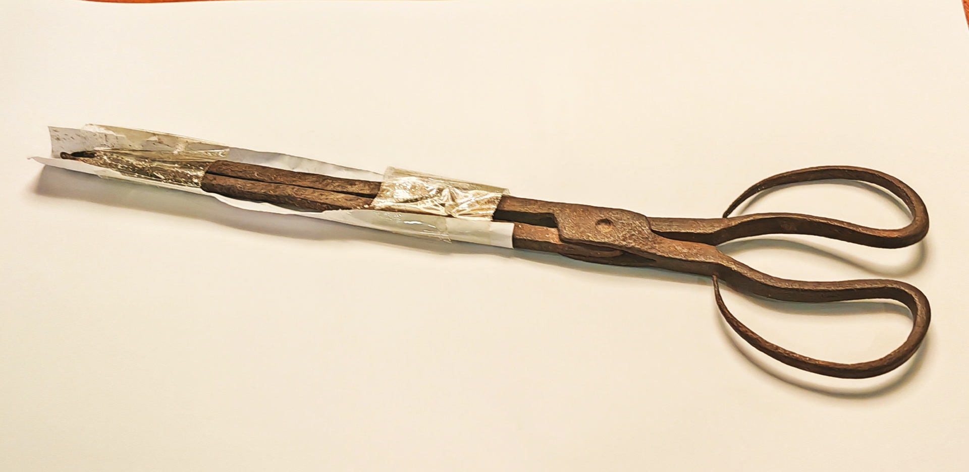 2025年11月2日,徐解秀阿婆孙子朱分永捐赠的90年前老物件“火钳”(作者摄)