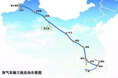 西气东输三线2012年开工,西起新疆,东至福建,途经10个省市、自治区,一干六支全长6790公里。