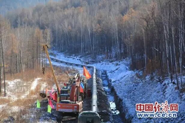 中俄原油管道北起俄罗斯斯科沃罗季诺市,经过中国黑龙江省和内蒙古自治区,止于大庆市,其中在俄罗斯境内长约70千米,在中国境内长约900多千米,2011年1月1日正式启用,设计年输油量1500万吨,最大年输油量3000万吨,是中国油气进口东北方向的一条战略要道。